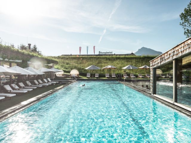 Die wertvolle Sole, die aus dem nahen Bad Reichenhall stammt, ist besonders wohltuend für Haut und Gelenke. Und auch die Kulisse wirkt wie Balsam für die Seele: Tauchen Sie ein in 36°C warmes Wasser mit kaiserlichem Ausblick zum Wilden Kaiser.