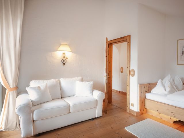 Lichtdurchflutetes Wohnzimmer mit gemütlichem Sitzbereich, Schlafzimmer mit Zirben-Doppelbett, Kinderzimmer mit Einzelbett und ausziehbarer Couch, 1 Badezimmer mit Dusche und Doppelwaschbecken, getrenntes WC, Telefon, WLAN, Minibar, Safe, pro Zimmer ein Flatscreen-TV, Nespresso-Maschine mit nachhaltigen Kapseln, Südbalkon mit Blick auf unser Lipizzaner-Gestüt