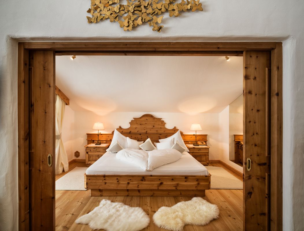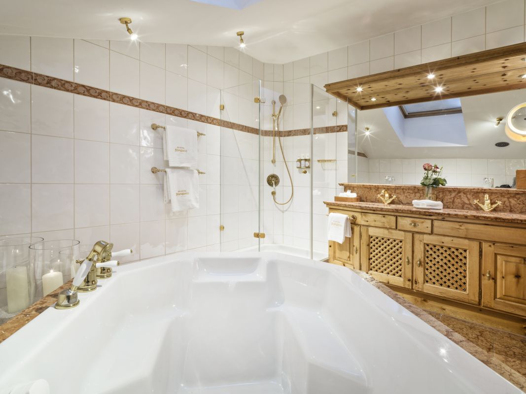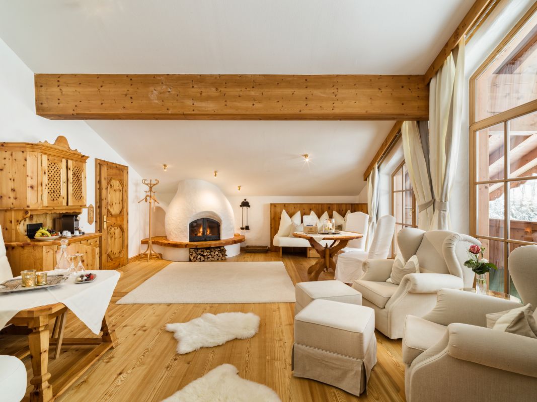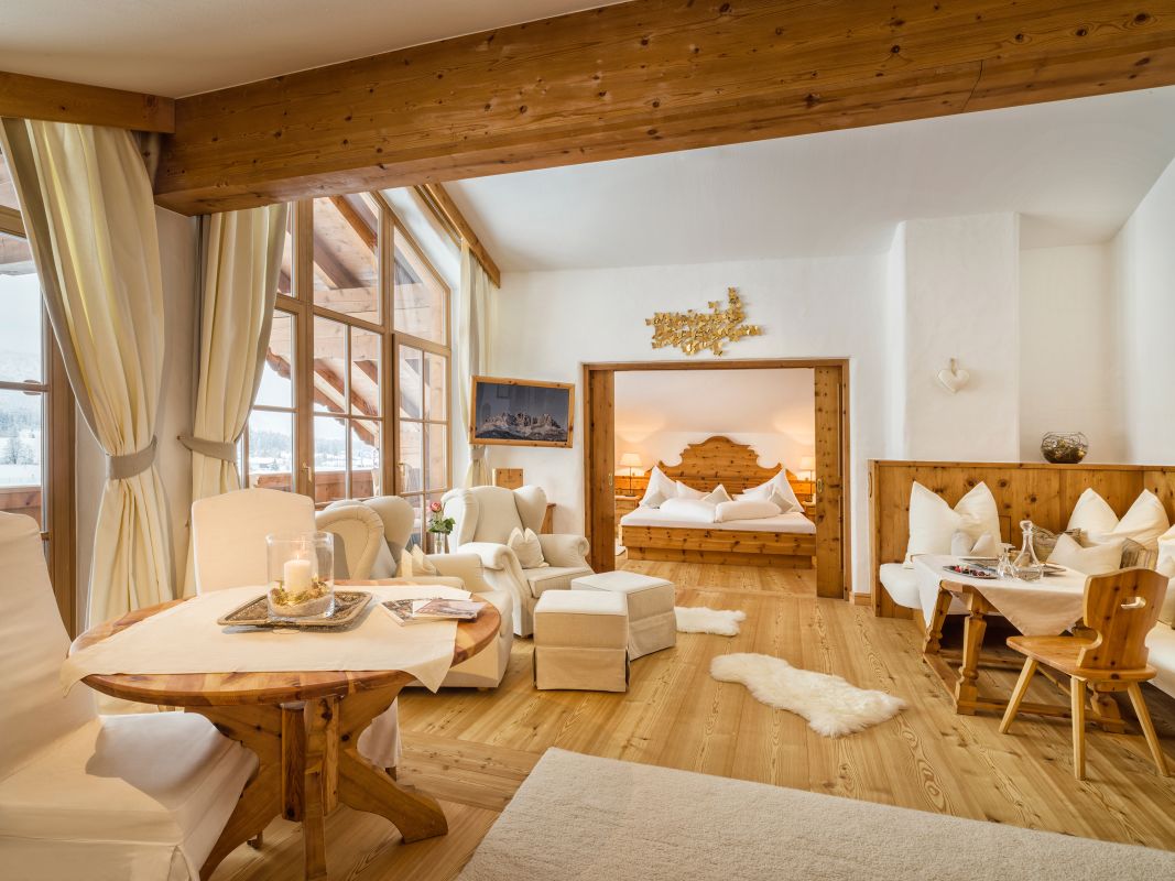 Großzügiges Wohnzimmer mit gemütlicher Lounge-Ecke und offenem Kamin, 1 oder 2 Schlafzimmer mit Zirben- Doppelbetten, 1 oder 2 Badezimmer mit Doppelwaschbecken, Badewanne und Dusche, getrenntes WC, begehbarer Ankleideraum, Telefon, WLAN, Minibar, Safe, pro Zimmer ein Flatscreen-TV, Nespresso-Maschine mit nachhaltigen Kapseln, großer Balkon mit Blick zum Wilden Kaiser, bei 2 Schlafzimmern direkter Lift in die Suite und weiterer Balkon