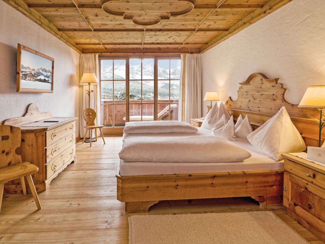 Wohnzimmer mit gemütlicher Lounge-Ecke und großteils offenem Kamin, Schlafzimmer mit Zirben-Doppelbett, geräumiges Badezimmer mit Doppelwaschbecken, Badewanne und Dusche, getrenntes WC, begehbarer Ankleideraum, Telefon, WLAN, Minibar, Safe, pro Zimmer ein Flatscreen-TV, Nespresso-Maschine mit nachhaltigen Kapseln, großer Balkon oder Terrasse mit Blick zum Wilden Kaiser