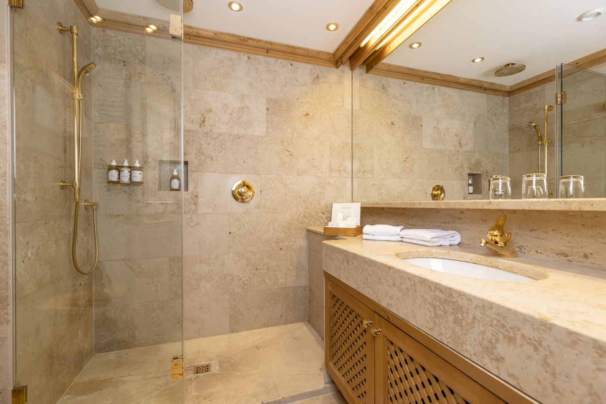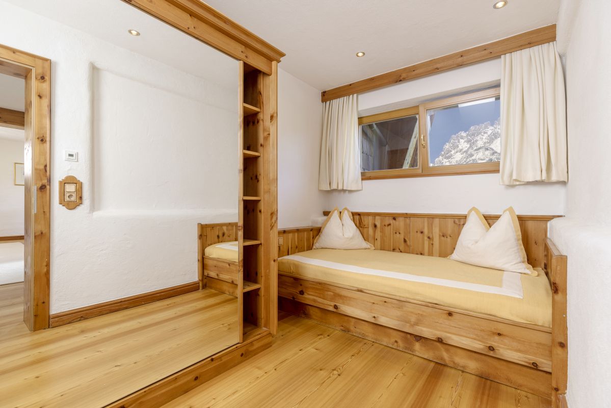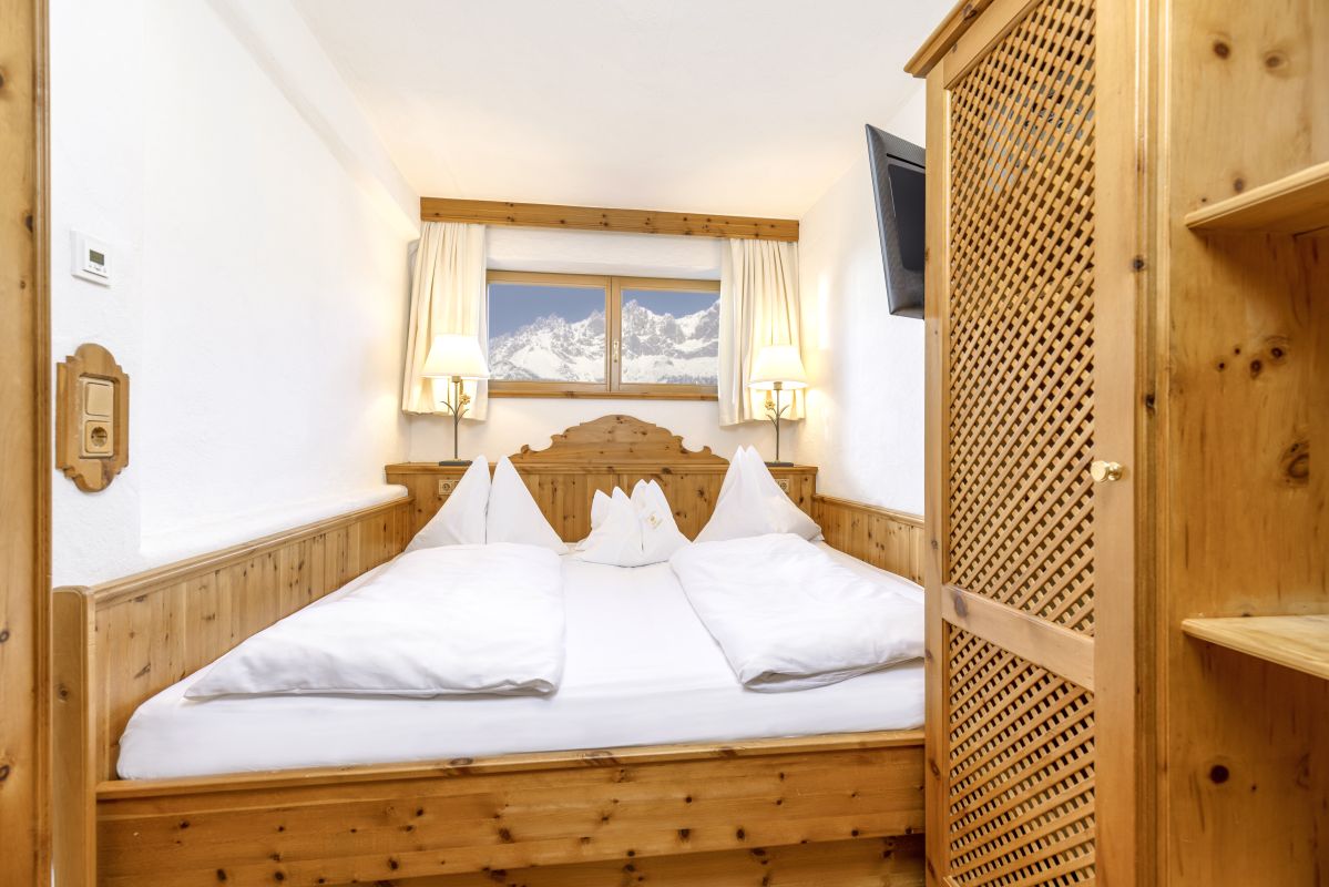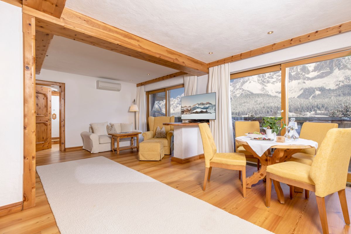 Großer Wohn- & Schlafraum mit Esstisch, gemütlicher Sitzecke und Zirben-Doppelbett, Kinderzimmer mit großem Kuschelbett, zweites kleines Kinderzimmer mit Einzelbett, zwei Bäder mit jeweils Waschbecken und WC sowie einmal mit Badewanne und einmal mit Dusche, Telefon, WLAN, Minibar, Safe, Flatscreen-TV, Nespresso-Maschine mit nachhaltigen Kapseln, Klimatisierung, Balkon mit Blick zum Wilden Kaiser