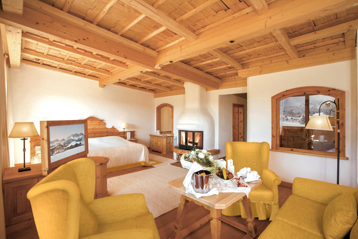 Luxuriöse Panorama-Suiten mit großzügigem Wohn-Schlafraum, Lounge-Bereich, offener Kamin, großes Zirben-Doppelbett, separates kleines Kinderzimmer mit Einzelbett, Badezimmer mit Doppelwaschbecken, Badewanne und Dusche, Sauna, getrenntes WC, begehbarer Ankleideraum, Telefon, WLAN, Minibar, Safe, Flatscreen-TV, Nespresso-Maschine mit nachhaltigen Kapseln, Klimatisierung, großer Balkon mit Blick zum Wilden Kaiser
