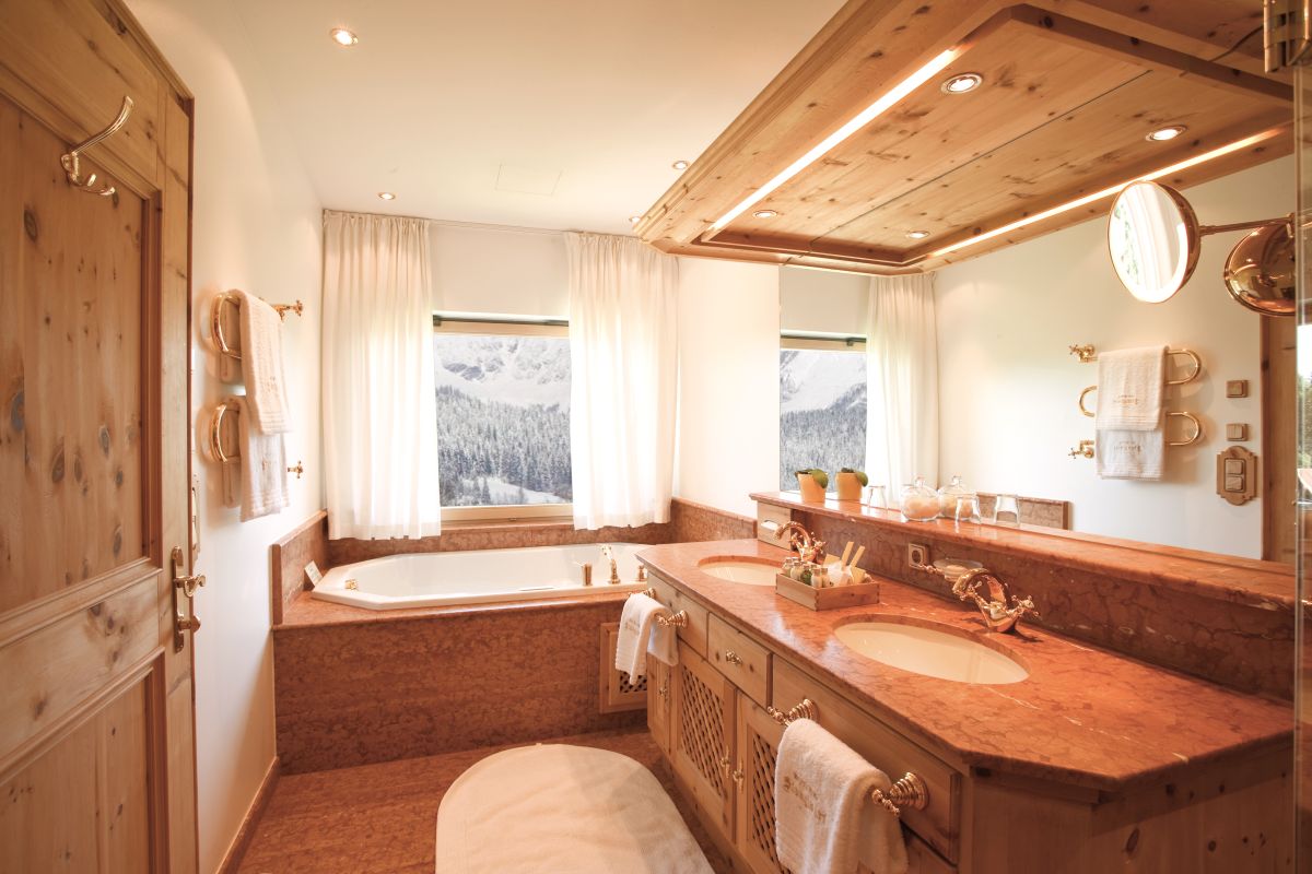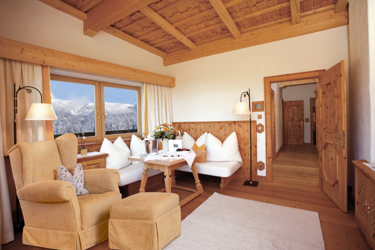 Wohnzimmer mit gemütlicher Lounge-Ecke und offenem Kamin, hochwertige Zirbenholzmöbel, 2 Schlafzimmer (davon 1 x mit getrennten Betten), 1 Badezimmer mit Doppelwaschbecken, Badewanne und Dusche/WC, zweites kleines Badezimmer mit Waschbecken und Dusche/WC, Telefon, WLAN, Minibar, Safe, pro Zimmer ein Flatscreen-TV, Nespresso-Maschine mit nachhaltigen Kapseln, Klimatisierung, großer Balkon mit Blick zum Wilden Kaiser