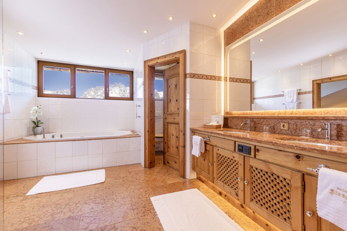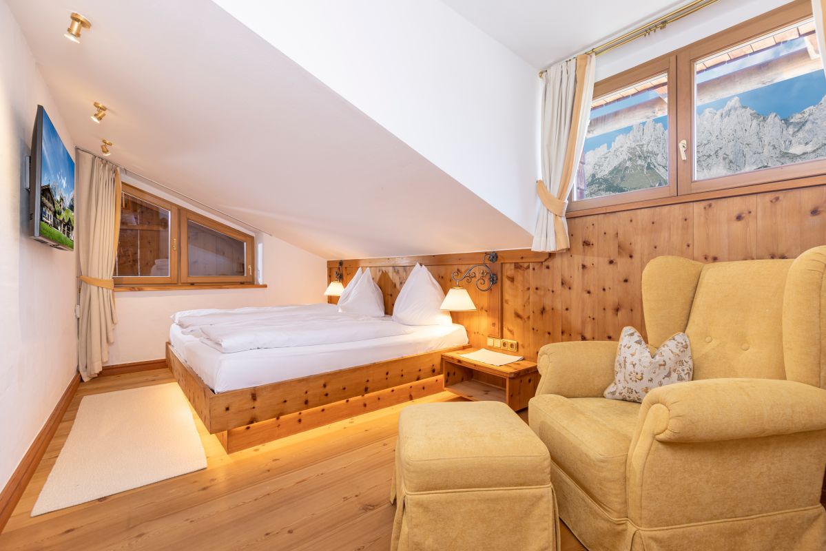 Wohnzimmer mit gemütlichem Lounge-Bereich und offenem Kamin, 2 Schlafzimmer mit je einem Zirben-Doppelbett, 1 Badezimmer mit Doppelwaschbecken, Badewanne und Dusche, getrenntes WC, Telefon, WLAN, Minibar, Safe, pro Zimmer ein Flatscreen-TV, Nespresso-Maschine mit nachhaltigen Kapseln, 2 große Balkone, davon einer mit Blick zum Wilden Kaiser