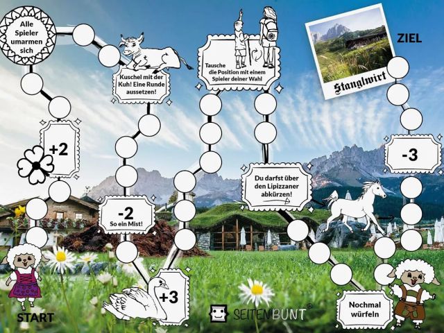 Mit Fotorahmen, Ausmal-Sticker und Deko-Klebeband können Erinnerungsfotos und kreative Kunstwerke im eigenen Büchlein gestaltet und verziert werden. Für noch mehr Spaß enthält das kinderleichte Set zwei Brettspiele rund um den Stanglwirt und seine tierischen Bewohner.