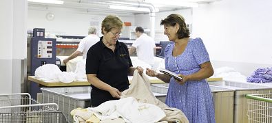 „Wir kümmern uns um drei Tonnen Wäsche pro Tag, darunter Tausende von Handtüchern“, beschreibt sie den beeindruckenden Wäscheberg. Nur drei Stunden dauert es, bis die Handtücher wieder fein säuberlich gefaltet für den nächsten Gast bereitliegen. Eine Bestzeit? Magdalena Hauser wiegelt ab: „Ich habe sechs Leute in meinem Team, wir schaffen das ganz gut.“ Was aber ist das Geheimnis, um die Handtücher so schmeichelweich hinzukriegen? Hauser: