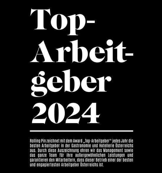 Auch 2024 dürfen wir uns wieder über die Auszeichnung als Top-Arbeitgeber by RollingPin freuen. Bei der Kür der „Top Arbeitgeber“ mussten wir einen intensiven Prozess durchlaufen: Zuerst eruierte Rolling Pin im Zuge einer großangelegten Umfrage unter Mitarbeitern der Gastronomie und Hotellerie jene Kriterien, die einen Top-Arbeitgeber auszeichnen. Die Angaben von über 11.000 Teilnehmern wurden im Anschluss vom Rolling Pin mit den Ergebnissen eines komplexen Audits von 31 Gastronomiebetrieben und Hotels verglichen. Daraus ergaben sich je nach Ergebnis die Auszeichnungen für die einzelnen Betriebe, die somit aufrichtige Aussagekraft haben.
