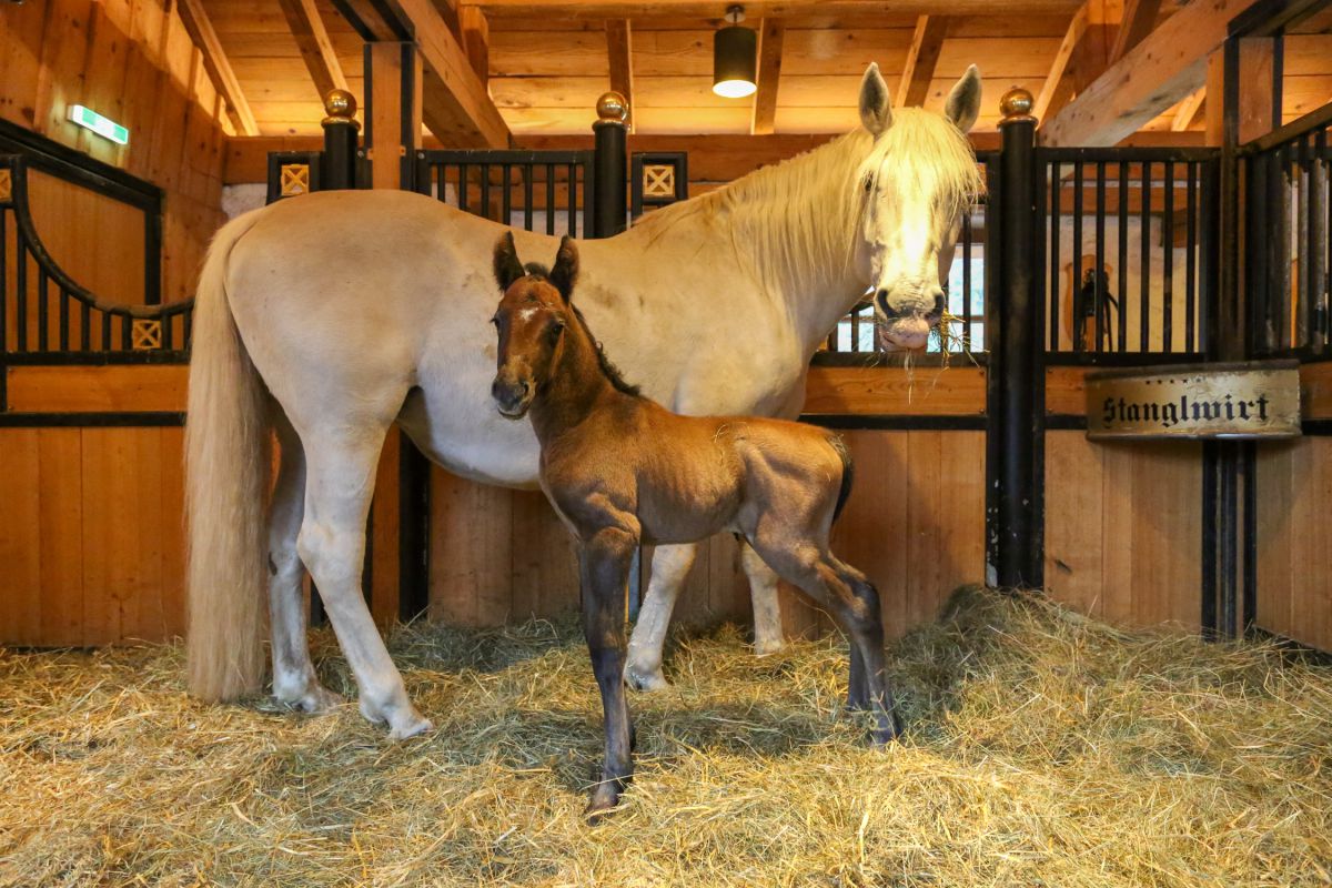 Große Freude herrscht in unserem Lipizzanergestüt - nach einer kurzen, unkomplizierten Geburt erblickte das süße Stutfohlen „Tosca“ am 07. April um 20:48 Uhr das Licht beim Stanglwirt! Für die Mutter „Thais“ ist es das zweite Fohlen, nach ihrem erstgeborenen Hengst 2020 nun eine wunderschöne Stute. Der Vater ist „Conversano Samira“, ebenfalls gezüchtet und geboren im eigenen Gestüt und Urenkel zum Gründer unserer Zucht, dem berühmten Lipizzanerhengst „Pluto Verona“.