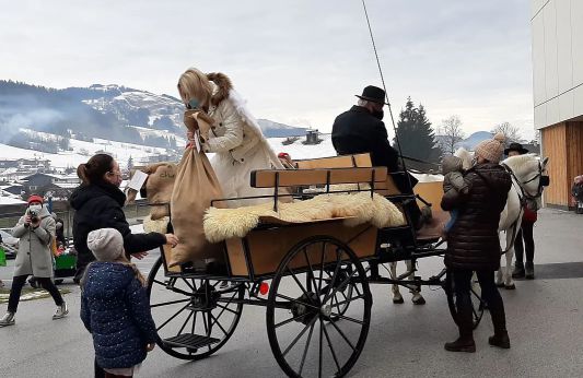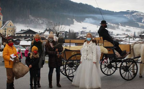Am 23. Dezember 2020 erwartete die Kinder der Volksschule, Kindergarten und Krabbelstube in Going eine weihnachtliche Überraschung. Der Stanglwirt-Weihnachtsengel fuhr dabei mit der Lipizzanerkutsche vor und verbreitete Weihnachtszauber bei den staunenden Kindern. Anschließend überreichte unser Weihnachtengel an alle ein kleines Geschenk.