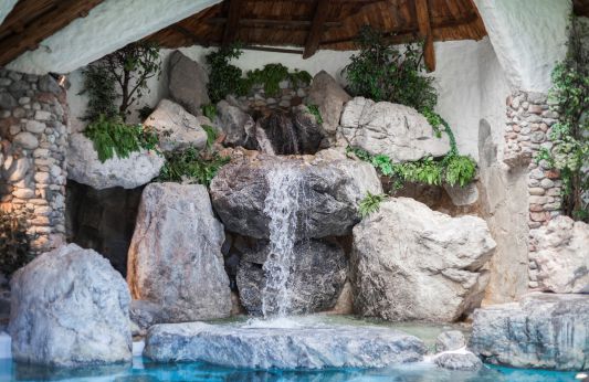 Red variegated sandstone from the Wilder Kaiser, white limestone rock and silver quartzite from the Dolomites, interspersed with solid, 200-million-year-old rock slabs. The natural, raw charm of the rock sauna immediately casts its spell over every guest, creating as it does so a soothing climate that is totally relaxing. Take an effervescent voyage of discovery through 1,200 m² of grottos, caves, waterfalls and streams, with countless spots to pause for a while.