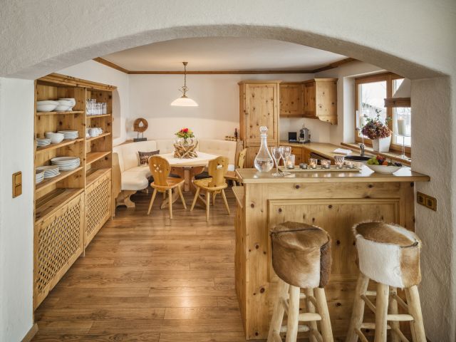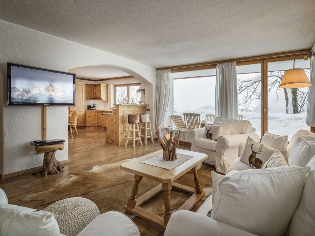 The Steinerhaus garden apartment covers an ample 140 m², all of which are furnished in the exclusive and traditionally luxurious Stanglwirt style, with satisfying, delightfully bright rooms. The apartment comprises two large double rooms - each with ensuite bathroom and bath, a cosy children's room with two separate beds and ensuite bathroom, a large living-dining room with open fireplace, and a lovely garden. The fully furnished living-dining room has everything you need for a comfortable life. There are also several flatscreen TVs for extra luxury.
