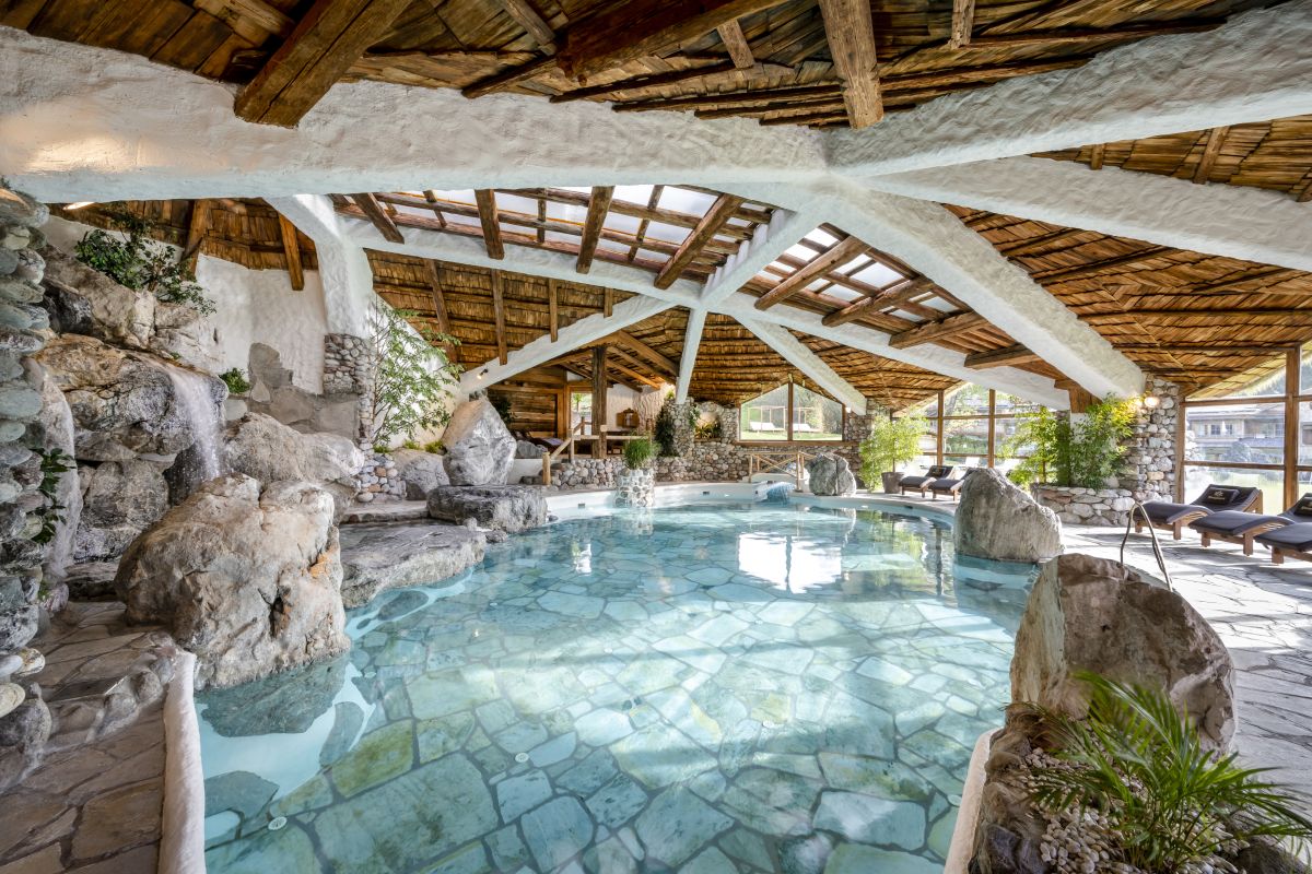- 3,110 m² in size, segregated wellness and water adventure world for families with: Indoor rock spa complete with outdoor pool, rock sauna area (with salt steam grotto, Arolla pine eco-sauna, Wilder Kaiser sauna and stone sauna), whirlpool with a view over the marine aquarium, including a coral reef, spacious relaxation zones with water beds and a panoramic view