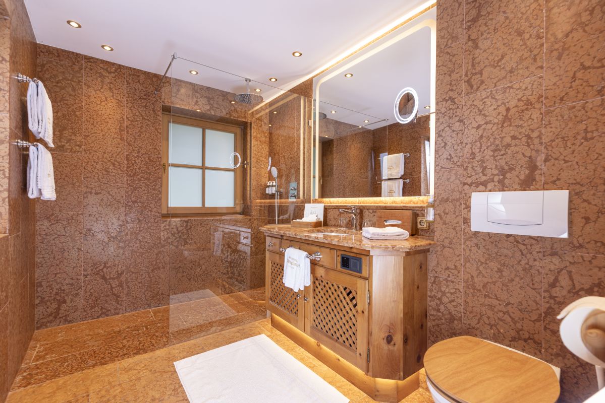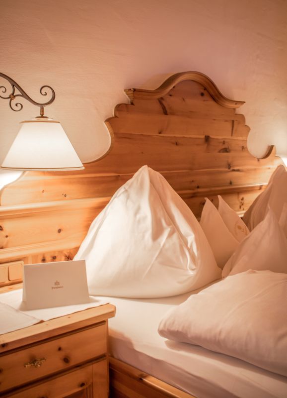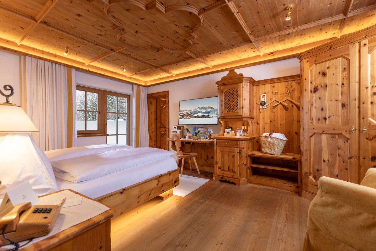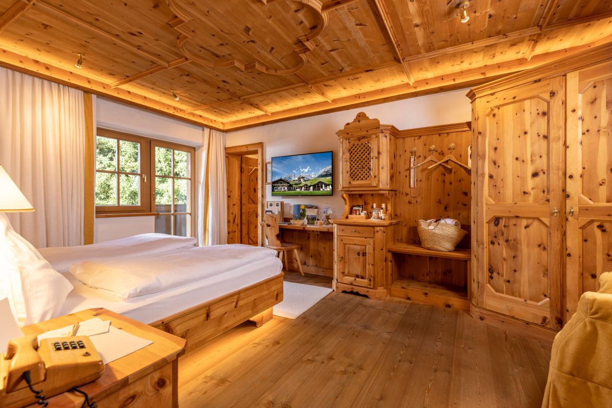 Double room with Swiss stone pine furniture, shower or bathtub/ WC, hairdryer, desk and/or cosy seating area, telephone, Wi-Fi, minibar, safe, flatscreen TV, Nespresso machine incl. sustainable capsules (due to space limitations only available on request in certain rooms), balcony or terrace, street side and no view on the ‘Wilder Kaiser’ mountain