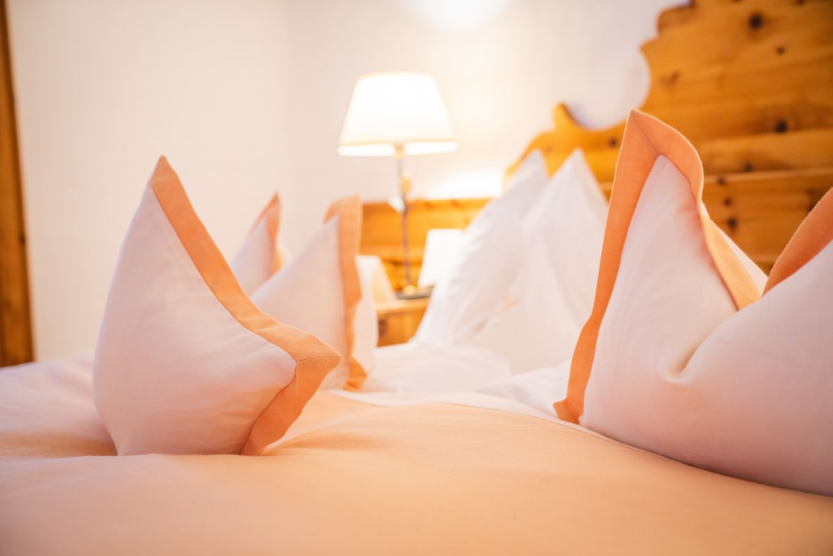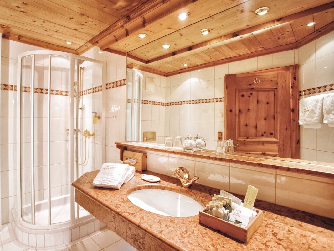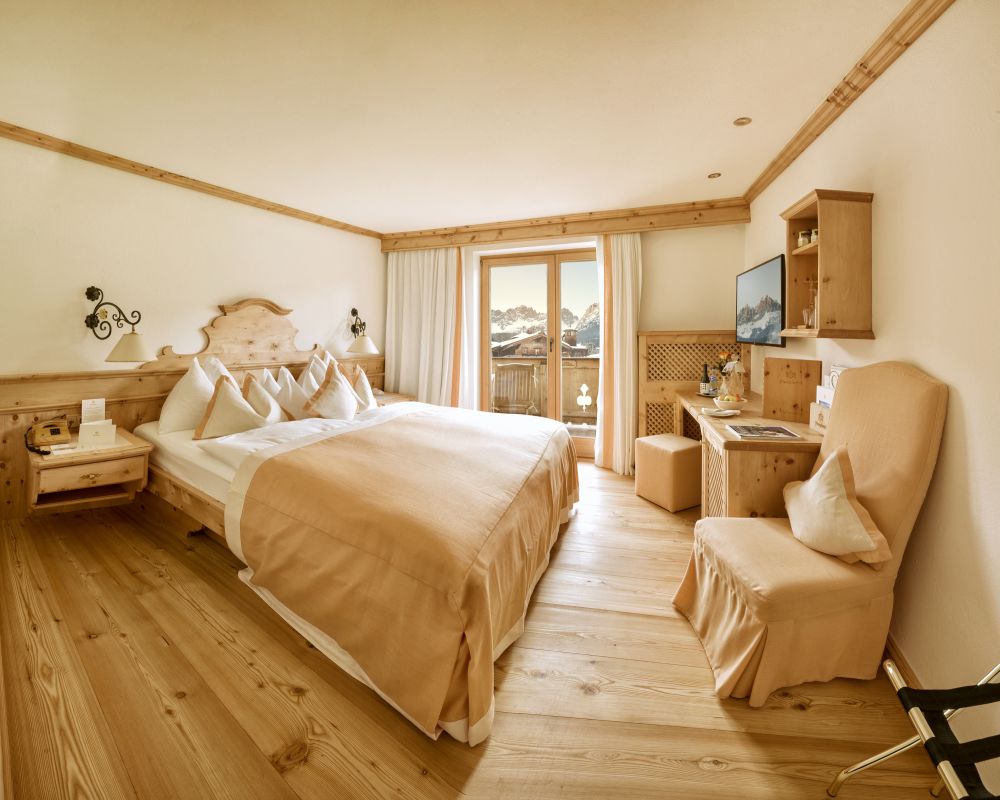 Double room with Swiss stone pine furniture, shower or bath/ WC, desk and/or cosy seating area, telephone, Wi-Fi, minibar, safe, flatscreen TV, Nespresso machine incl. sustainable capsules (due to space limitations only available on request in certain rooms), balcony or terrace, most have view on the ‘Wilder Kaiser’ mountain