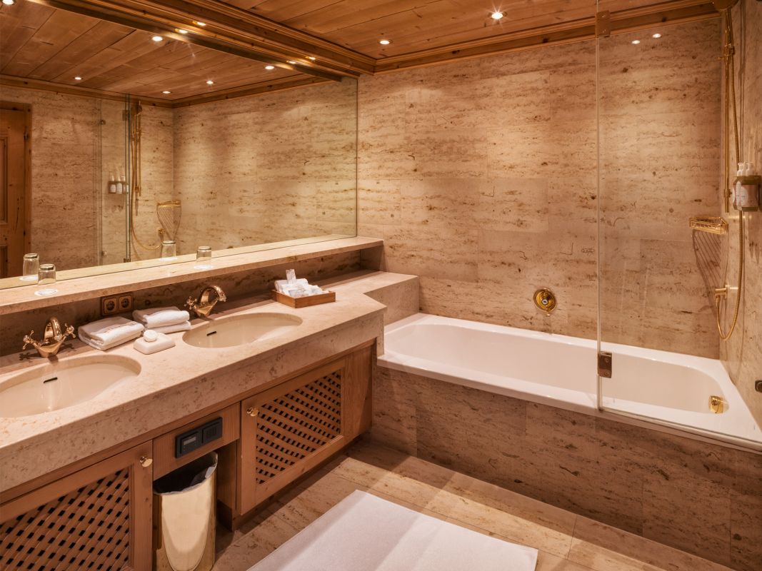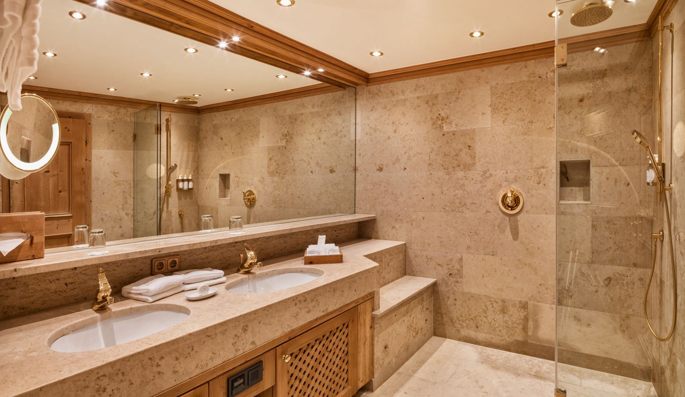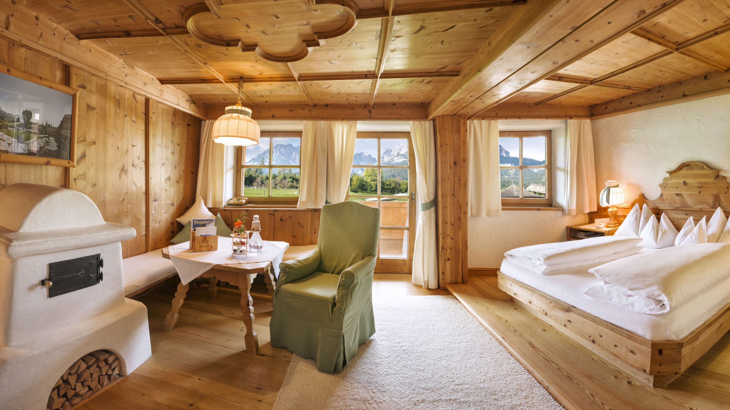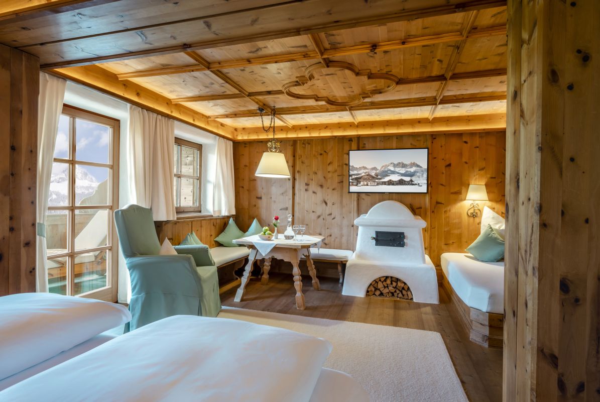 Comfortable combined bedroom and living space with highquality furniture and wood panelling made from Swiss stone pine, most with centrally heated tiled stove, walk-in wardrobe, bathroom with double washbasin, bathtub or generous rain shower, WC, seating area, lounge to relax on, telephone, Wi-Fi, mini-bar, safe, flatscreen TV, Nespresso machine incl. sustainable capsules (due to limited space in the Biohotel Studio only available on request), balcony or terrace – view on the ̔Wilder Kaiser̓ mountain or to the Lipizzaner studfarm