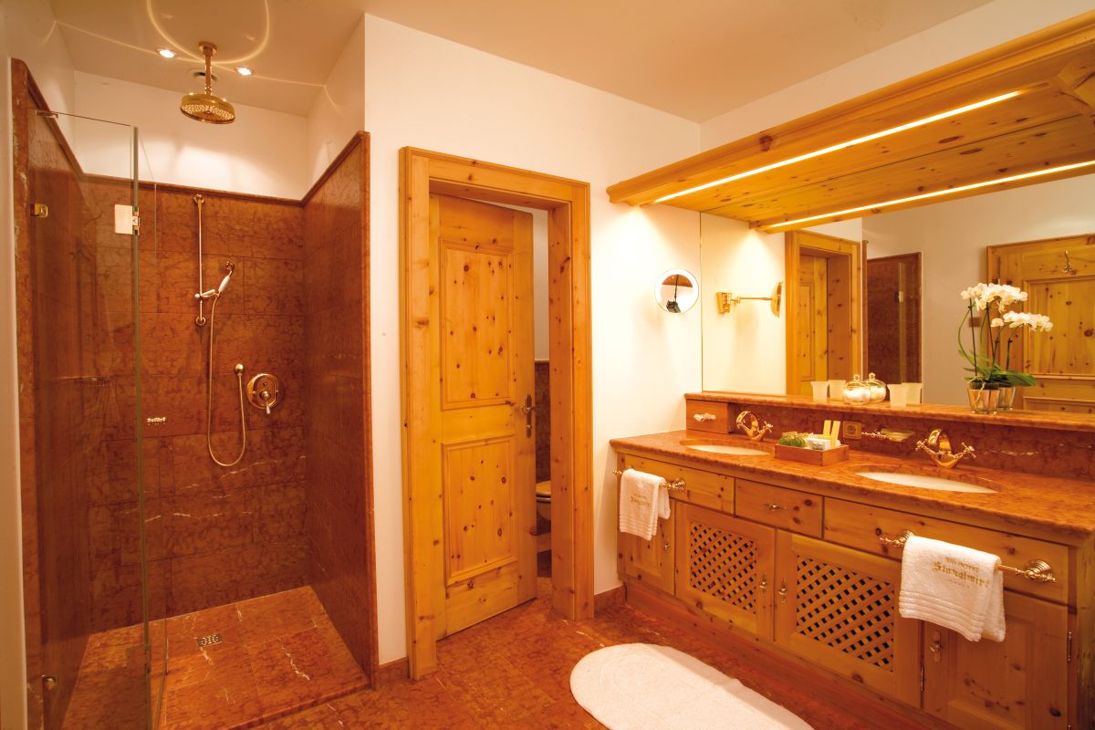 Large living room and bedroom with Swiss stone pine furniture, bathroom with bathtub and/or shower, separate WC, cosy seating area, telephone, Wi-Fi, mini-bar, safe, flatscreen TV, Nespresso machine incl. sustainable capsules, balcony or terrace partially with view on the ‘Wilder Kaiser’ mountain and/or sheep meadow