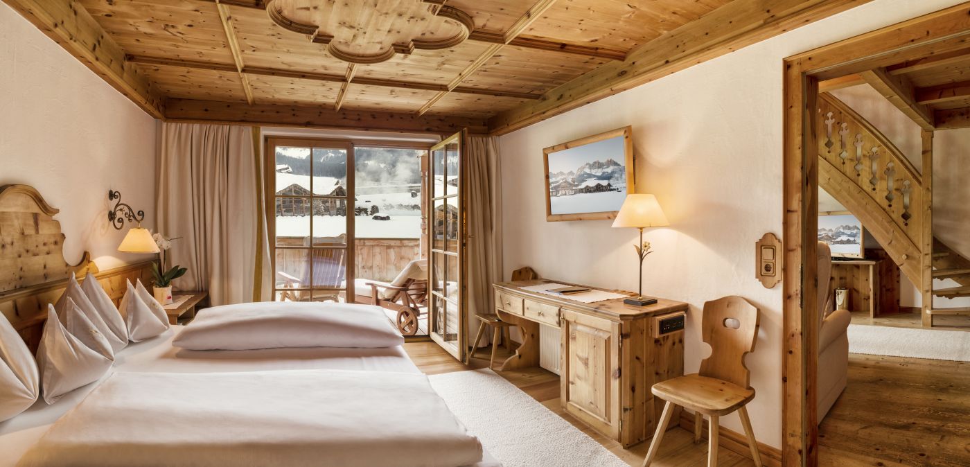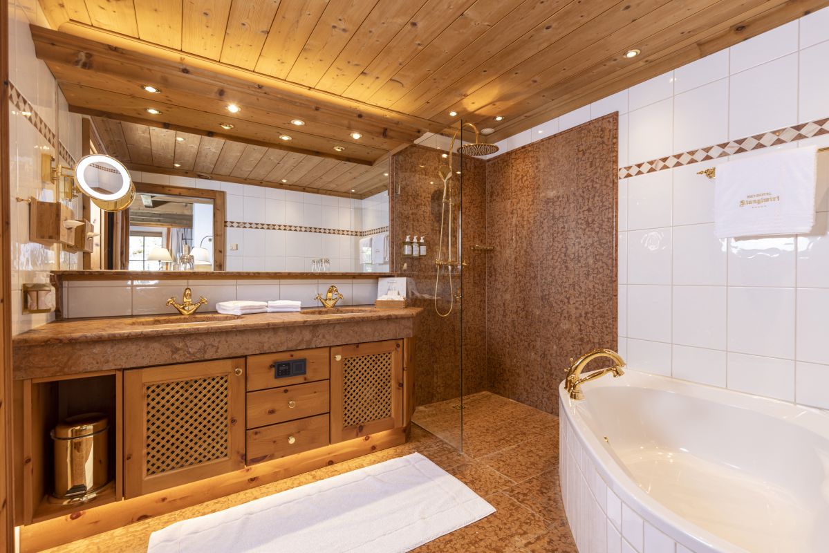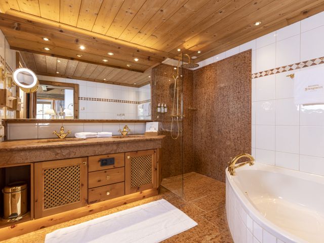 Living room with lounge area and open fireplace, Swiss stone pine furnishings, 2 or 3 bedrooms - of which 1 open bedroom is accessible via an internal staircase, 2 or 3 bathrooms with double washbasin and shower, 1 with corner bathtub, separate WC, walk-in wardrobe, telephone, Wi-Fi, minibar, safe, each room has a flatscreen TV, Nespresso machine incl. sustainable capsules, terrace with direct access to the 'Kaiserwiese'