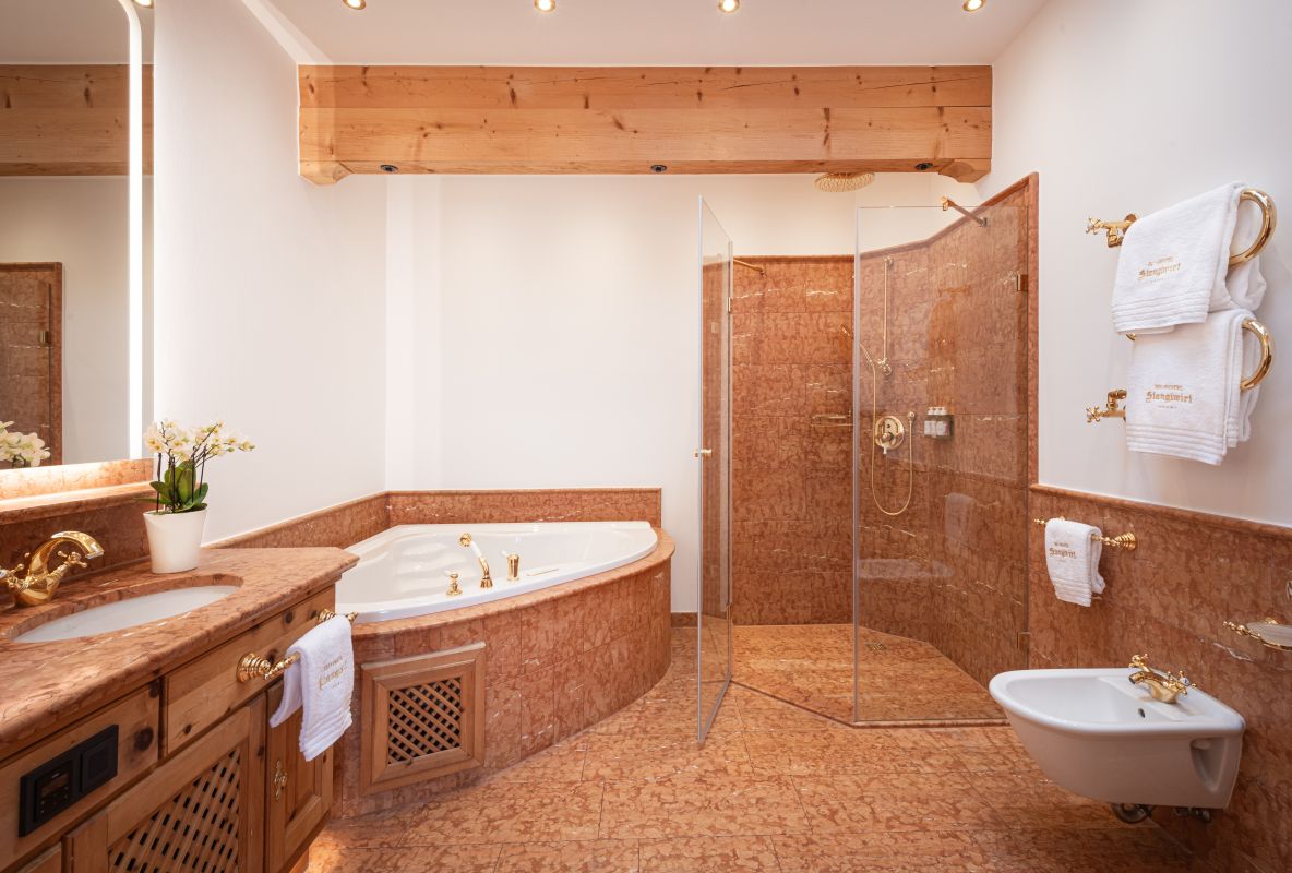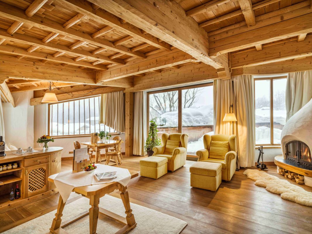 Spacious living room and open fireplace, 1 or 2 bedrooms with Swiss stone pine double beds, 1 or 2 bathrooms with double washbasin, bathtub and shower, separate WC, walk-in wardrobe, telephone, Wi-Fi, mini-bar, safe, each room has a flatscreen TV, Nespresso machine incl. sustainable capsules, air-con, large balcony with view on the ‘Wilder Kaiser’ mountain
