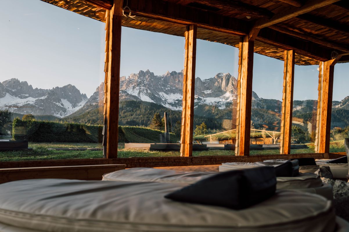 Even on your way to the panoramic relaxation area, walking up the stone steps from the rock sauna, you discover just how pleasingly soothing the gentle murmuring of a mountain stream can be. When you arrive, you are greeted by a stunning view of the majestic crags of the Wilder Kaiser.